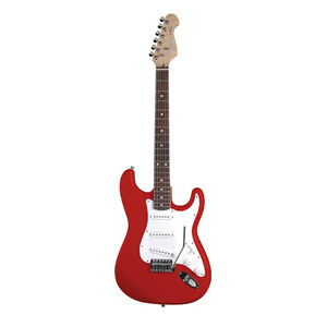 Guitarra eléctrica CRUZER mod. ST-200/RD, cuerpo de tilo, brazo de maple, diapasón de palo de rosa, maquinaria diecast cromo,pickups S+S+H,controles 1V+2 T, selector de 5 posiciones, puente vintage, tremolo cromado.