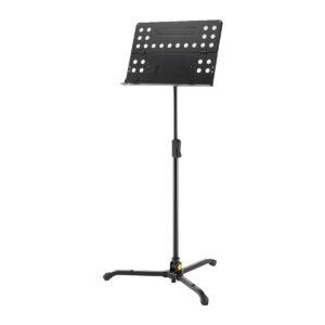 Atril Hercules para partitura. Modelo: BS418B. Cuerpo de tres secciones para unaregulación más baja. Bandeja perforada con sujeta-páginas. Bandeja en dos partes con EZ Roller. Ajuste de altura Quik-N-EZ. Base trípode fabricada en aluminio die cast. Tamaño de la bandeja: 480 x 345 mm. Altura: 610 – 1150 mm. Peso: 3.2Kg. Tamaño plegado: 670 x 210 mm.