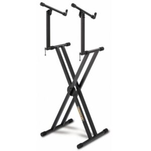 Stand para teclado Hercules KS-240B de cruz doble, dos niveles, tubería de 1.18”, peso 10kg.Bandeja EX-LOK para un Segundo teclado. Con inclinación de 70°-90°. El sistema EZ-LOK bloquea automáticamente el soporte en una de las 5 posiciones de altura.
