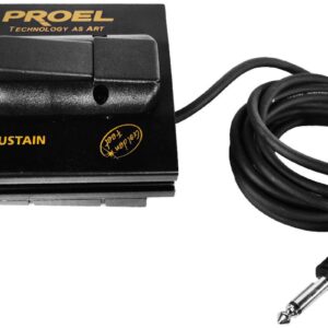 Pedal Proel de sustain para teclado mod GF-24. Ancho: 9.8 cm, alto: 4.5 cm, fondo: 9 cm, peso: 0.23 kg. Incluye cable de 2 mt, con interruptor de cambio de polaridad. Fabricado con aluminio de alta resistencia, con gomas antideslizantes. Sesuministra con un cable de 2 m jack mono de 6,3 mm.