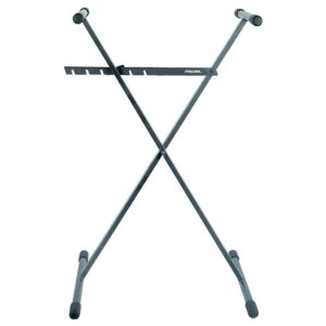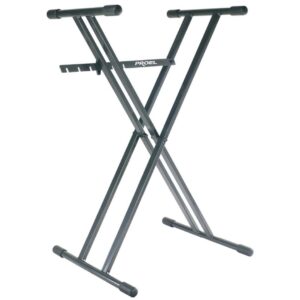Stand Proel para teclado. Modelo: KB200. En forma de cruz. Brazos extendibles para hacerlo a dos niveles. Peso: 5.12 Kg. Dimensión del tubo: 30 x 15 x 1.2 mm. Capacidad de carga: 75 Kg. Altura mínima: 670 mm. Altura máxima: 950 mm. Longituddel brazo: 400 mm. Color: Gris oscuro.