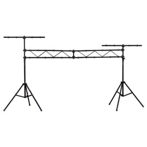 Soporte Proel para iluminación. Modelo: KITLHST. Carga máxima de 50 Kg. Incluye2 soportes ajustables profesionales con una altura máxima de 3 mts, 2 barras horizontales para 8 reflectores, 2 trusses de aluminio (longitud única de la truss:1.5 mts). Incluye una resistente bolsa de nylon. Altura: 1470 -> 3000 mm. Dimensión de la base: 110 mm. Dimensión del tubo: 30 x 1.5 mm. Longitud del brazo: 3000 (2 x 1500) mm. Aluminio negro anodizado. Peso: 3 Kg.