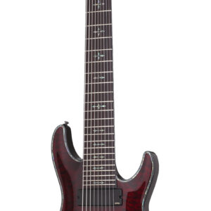 Guitarra eléctrica sólida de 9 cuerdas, cuerpo de caoba, tapa arqueada de maple acolchado, hardware negro, construcción Set-Neck con Ultra Access, unión de Abalone con negro/blanco/negro multicapa, puente Hipshot Hardtail (.125) con String Thru Body, maquinaria Schecter Locking, brazo de C delgado de 3 piezas de caoba con varillas de refuerzo de fibra de carbono, diapasón de palo de rosa, incrustaciones de cruces góticas de Abalone, escala: 28” (711 mm), 24 trastes X-Jumbo, cejuela de grafito de 2.5” (63.5 mm) de ancho, alma ajustable de 2 vías con tuerca Allen de 5/32” (4 mm), dos volúmenes y un tono, selector de 3 posiciones, pastilla del puente: EMG 909, pastilla del brazo: EMG 909, perillas de metal moleteado con tornillo de ajuste.