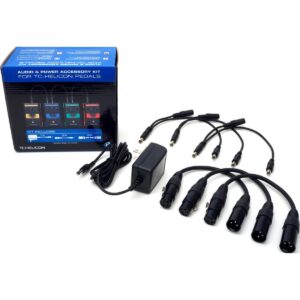 Paquete de accesorios de TC Electronic para pedales que incluye 1 adaptador de corriente 12V, 1A, 3 conectores daisy-chaining DC, y 3 cables XLR cortos.