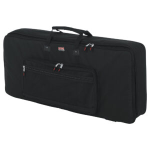Estuche ligero para teclado de 61 teclas, fabricado con resistente nylon con marco interior reforzado con polietileno, interior forrado con tricot y espuma suave, correas acolchadas totalmente ajustables para asegurar el teclado en su lugar durante el transporte, grandes compartimentos para accesorios en el exterior para pedales y cables, ruedas integradas con manija de remolque y barras deslizantes.