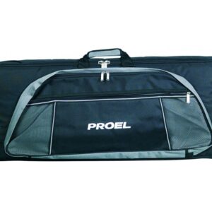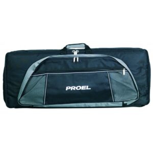 Funda Proel para teclado. Modelo: BAG-9100PBG. Fabricada con resistente nylon 840D con bordes de tela. Interior acolchado de espuma de alta densidad de 20 mm deespesor. Agarraderas de nylon reforzado con velcro. La correa para hombro es acolchada y ajustable y se asegura en la parte trasera con sólidos aros de metal.Amplios bolsillos al frente para guardar partituras y accesorios.