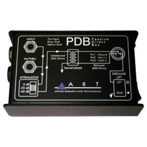 Caja directa doble y pasiva con control de atenuación y switch de tierra, atenuación de entrada conmutable, (0 dB, – 20 dB, – 40 dB), entrada de instrumento: 50 kilo-ohms, jack paralelo de 50 kilo-ohms, con conector de salida XLR de 600 ohms.