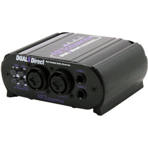 Caja directa dual activa, voltaje phantom o batería de 9V, 2 canales, entradas: 2 x XLR/TRS combo, salidas: 2 x XLR, 2 x TRS thru, medidas: 4.6 x 9.9 x 11.6 cm, peso: 0.38 kg.