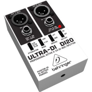 Caja DI activa profesional multiusos de 4 canales, booster y aislador de línea, para aplicaciones de estudio y escenario, proporciona impedancia y coincidencia de señal para la conexión directa de instrumentos a mezcladoras y amplificadores, respuesta de frecuencia ultraplana gracias a los renombrados transformadores Behringer OT-1, aumento de ganancia total de +18 dB en tres incrementos de +6 dB para preamplificación de señales de bajo nivel, el switch Ground Lift elimina los problemas típicos de loop de tierra, atenuación de salida conmutable de -20 dB, conectores Neutrik Combo y XLR chapados en oro, alimentado a través de una fuente de alimentación externa DC (incluida) con funcionamiento opcional a baterías (no incluidas), dimensiones: 483 x 71 x 44 mm, peso: 1.4 kg.