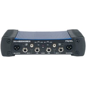 Caja directa Proel. Modelo: DB2A. Caja directa activa de dos canales. ConectoresJack, XLR y RCA con posibilidad de linkeo. Todas las conexiones en el mismo lado. Opciones de potencia: Batería de 9V, adaptador de suministro externo AC/DC. Ancho: 215 mm. Alto: 50 mm. Profundidad: 125 mm. Peso: 1 Kg. Media unidad de rack, se pueden juntar las unidades. Fuente de alimentación: Potencia Phantom, Adaptador externo AC/DC: o batería de 9V.