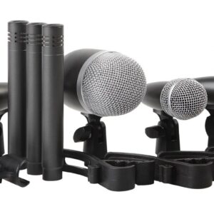 Set de micrófonos para batería, contiene un micrófono DM12 para bombo, 4 micrófonos DM1 para tarola y toms, 4 clips APM47 (para DM1), 3 micrófonos CM602 de condensador para contratiempos y overheads con clip para soporte y estuche compartimentado con espuma.