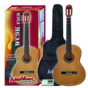 Paquete de guitarra clásica Washburn mod WC9K. Tapa de abeto, lados y fondo de caoba, diapasón de rosewood, incluye afinador electrónico WT-10 y funda