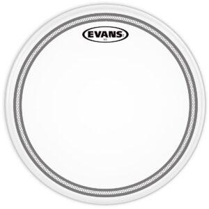 Parche Evans para tarola, tom o timbal de 10” pulgadas, serie EC Reverse Dot, fabricado con dos capas de película, una de 7 y otra de 10 milésimas de pulgada, sistema interno Edge Control que reduce armónicos y sustain, refuerzo central invertido para no interferir con las escobillas, hecho en USA.