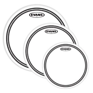 Juego de parches Evans EC2S Clear para tom, configuración: Fusion, diámetro: 10”, 12” y 14” pulgadas, fabricados con dos capas de película de 7 milésimas de pulgada, terminado transparente, sistema Edge Control, anillo sintético controlador de armónicos mejora la afinación, ofrece sustain medio y brillantez, hecho en USA.