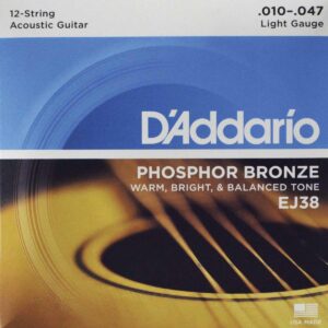 Juego de cuerdas de bronce fosforado para guitarra acústica de 12 cuerdas, blandas, calibres 10-47, diseñadas para todas las marcas y modelos de guitarras acústicas de 12 cuerdas, calidez, nitidez y tono acústico bien equilibrado, entorchado de precisión con bronce fosforado resistente a la corrosión, tono brillante y duradero, excelente entonación, paquete ecológico y resistente a la corrosión para conservar la frescura de las cuerdas.