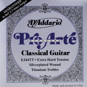 Juego de cuerdas de material compuesto para guitarra clásica, serie Pro-Arte, tensión extra dura, proyección y resistencia máxima, material exclusivo de multifilamentos trenzados en el núcleo, tono cálido y potente, núcleo de material compuesto exclusivo entorchado en cobre recubierto en plata para lograr un tono potente y duradero, paquete ecológico y resistente a la corrosión para conservar la frescura de las cuerdas.