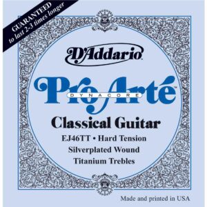 Juego de cuerdas para guitarra clásica, serie Pro-Arte Dynacore, agudos de titanio, tensión dura, material de multifilamentos trenzados para el núcleo, que utiliza una técnica revolucionaria de devanado, tono único y contemporáneo, estabilidad de afinación y consistencia mejorada, núcleo de material compuesto flexible.