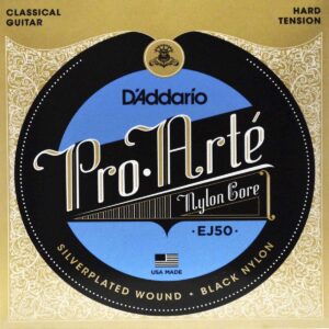 Juego de cuerdas de nylon negro para guitarra clásica, serie Pro-Arte, tensión dura, las cuerdas graves están entorchadas en cobre recubierto en plata sobre un núcleo de nylon de multifilamentos, las cuerdas agudas de nylon negro están clasificadas mediante un sistema láser para proporcionar entonación consistente y precisa, paquete ecológico y resistente a la corrosión para conservar la frescura de las cuerdas.