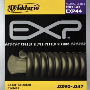 Juego de cuerdas recubiertas para guitarra clásica, tensión extra dura, calibre.0290 – 047, óptimas para lograr la proyección y resistencia máxima de la cuerda sin comprometer el tono, sonido natural y de larga duración, sonido fresco y brillante, ”tono de cuerda nueva”, nylon transparente, sin terminación de bola, paquete ecológico y resistente a la corrosión para conservar la frescura de las cuerdas.