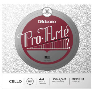Juego de cuerdas para violonchelo, serie Pro-Arte de D’Addario, escala 4/4, tensión media, aptas para violonchelos de 4/4 con una longitud de 27 1/2” pulgadas (700 mm), núcleo sintético de Pro-Arte, tono cálido y melodioso, menos sensibles a los cambios de humedad y temperatura, permiten un acostumbramiento rápido, maximizan la respuesta del arco, paquete ecológico y resistente a la corrosión para conservar la frescura de las cuerdas.