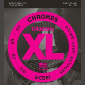 Juego de cuerdas serie Chromes para bajo eléctrico de 4 cuerdas, entorchado plano, entorchado con cordón y pulido para proporcionar una sensación extra suave y un tono cálido y melodioso, aptas para bajos de escala larga con una longitud de escala de la cuerda de hasta 36 1/4”, fabricado en USA, calibres: .045, .065, .080, .100, empaque ecológico y resistente a la corrosión.
