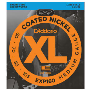Juego de cuerdas recubiertas para bajo de 4 cuerdas, serie EXP, tensión media, calibre .050 – .105, escala larga, tono brillante y profundo, cómoda sensación liviana, cuatro veces más durabilidad, aptas para bajos de escala larga con una longitud de escala de la cuerda de hasta 36 1/4” pulgadas, acero niquelado con tecnología de recubrimiento EXP, tono brillante, paquete ecológico y resistente a la corrosión para conservar la frescura de las cuerdas.