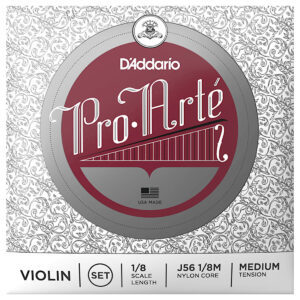 Juego de cuerdas para violín, serie Pro-Arte de D’Addario, escala 1/8, tensión media, aptas para violines de 1/8 con una longitud de 9 1/2” pulgadas (241 mm), núcleo sintético de Pro-Arte, tono cálido y melodioso, menos sensibles a los cambios de humedad y temperatura, acostumbramiento rápido, fabricadas con una menor tensión para maximizar la respuesta del arco, la combinación tonal y la facilidad de uso, paquete ecológico y resistente a la corrosión para conservar la frescura de las cuerdas.