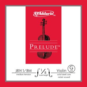 Cuerda individual Sol para violín, serie Prelude de D’Addario, escala 1/8, tensión media, apta para violines de 1/8 con una longitud de 9 1/2” pulgadas (241 mm), entorchada en níquel, núcleo de acero sólido, inalteradas por los cambios de temperatura y humedad, excelente respuesta del arco, sonido cálido durable, paquete ecológico y resistente a la corrosión para conservar la frescura de las cuerdas.