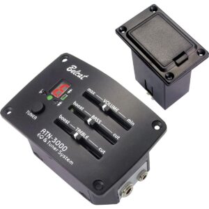 Preamplificador para guitarra electroacústica, EQ de 4 bandas con afinador cromático integrado, funciona con una pila de 9V, impedancia de entrada: 20 mili-ohms, impedancia de salida: 1 kilo-ohm, LED indicador de nivel de batería, pastilla OMEGA-II (piezo-cable), dimensiones: 72 x 50 mm.
