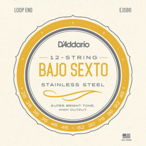 Encordadura para bajo sexto, acero inoxidable, tono súper brillante y respuesta magnética compatible con instrumentos que tienen pastillas electromagnéticas para amplificación, control de tensión loop-end, calibres: .026/.026, .036/.036, .046/.046, .062/.030, .078/.036, .092/.046, fabricadas en USA.