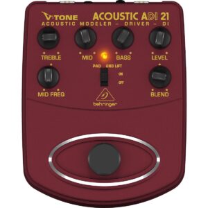 Pedal para guitarra acústica, modelo, V-TONE ACOUSTIC, modelado analógico de guitarra acústica con salida de grabación, circuitería de modelado de micrófono/bulbos, EQ de 3 bandas, modo DI dual para salida de grabación directa con emulaciónde bulbo o caja directa activa estándar en modo bypass, switch Ground Lift, funciona con pila de 9V o adaptador BEHRINGER PSU-SB DC (no incluido).
