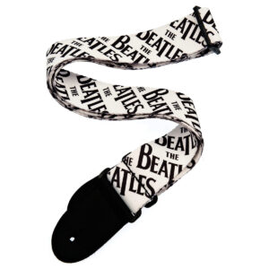 Tahalí para guitarra o bajo, diseño de logotipo negro de The Beatles, fabricado con poliéster impreso, ancho de 2” pulgadas, longitud de 35” a 59.5” pulgadas, máxima comodidad para situaciones de pie, extremos veganos de nylon fuertes y reforzados.