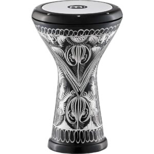 Doumbek de aluminio con parche sintético, vaso grabado a mano, incluye llave de afinación, dimensiones: diámetro: 8 1/2” pulgadas, altura: 17 1/8” pulgadas.