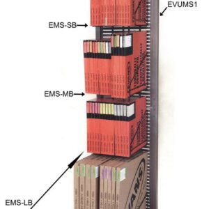 Exhibidor para parches, cada exhibidor se compone de los modelos: EMS-MB (canastillas), EMS-SB (canastillas), EMS-LB (canastillas), EVUMS1 (bases), EVUMS2 (patas) y EVUMS-SIGNKIT (logotipo), para obtener un exhibidor completo.