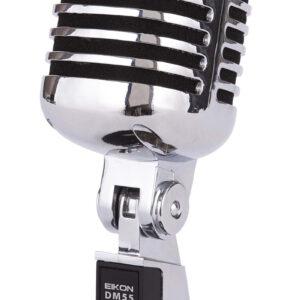 Micrófono vocal con diseño de estilo antiguo, carcasa metálica ligera en satín cromado, transductor: bobina móvil dinámica, patrón polar cardioide, respuesta de frecuencia: 50 Hz – 15 kHz, sensibilidad: -53 dBV ± 3 dB, SPL máximo: 135 dB, relación señal a ruido: 74 dB, impedancia: <600 ohms, conector: XLR macho de 3 pines, dimensiones: 180 x 45 mm, peso: 360 g.