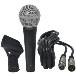 Micrófono dinámico cardioide con respuesta de frecuencia adaptada específicamente para aplicaciones vocales, switch On/Off, construcción metálica duradera, rejilla de bola de malla de acero con filtro integral para reducir el ruido de viento, conector XLR macho de 3 pines, dimensiones: 195 x 50 mm, peso: 275 g.