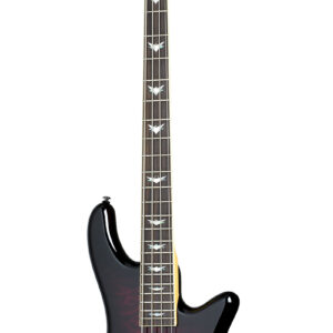 Bajo eléctrico de 4 cuerdas, cuerpo de tilo, hardware negro, tapa arqueada, construcción 6 bolt-on, puente Diamond Bass, maquinaria Schecter, brazo C delgado de maple, diapasón de palo de rosa, incrustaciones Pearloid Semi-Gótico, escala: 34” (863 mm), 24 trastes X-Jumbo, cejuela Graph Tech XL Black Tusq de 1.496” (38 mm) de ancho, alma ajustable de 2 vías con tuerca Allen de 5/32” (4 mm), un volumen, pastilla del puente: Schecter Diamond Bass, pastilla del brazo: Schecter Diamond Bas, perillas de metal moleteado con tornillo de ajuste.