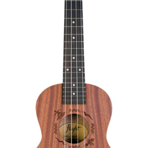 Ukelele concierto electroacústico con resaque, tapa, aros y fondo de caoba, puente de nogal, 17 trastes, brazo de okoume africano, diapasón de nogal, cejuela de hueso de 35 mm de ancho, montura de hueso, pastilla activa Flight FU-T3 con ecualizador y afinador incorporados, marcadores de posición en los trastes 5, 7, 10, 12 y 14, espalda arqueada, roseta grabada con láser, incluye funda.