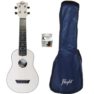 Paquete de Ukelele soprano Travel que incluye afinador Flight FTC-33 y funda, 12 trastes, tapa de linden, aros y fondo de plástico ABS. puente de plástico ABS, brazo de plástico ABS, diapasón de plástico ABS, cejilla y montura de plástico ABS, marcadores de posición en los trastes 5, 7, 10 y 12, espalda arqueada, traste 0, afinadores con engranaje abierto, marcadores de puntos.
