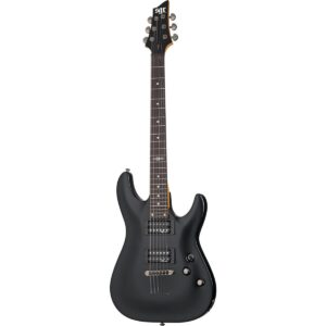 Guitarra eléctrica sólida, cuerpo de aliso, tapa plana de maple acolchado, unión de una capa de marfil, hardware negro, construcción Bolt-on, puente PT-H con monturas de acero inoxidable / String Thru Body, brazo C delgado de maple tostado, diapasón de maple tostado de 14” (355 mm) de radio, maquinaria Schecter Locking, incrustaciones de puntos, marcadores de puntos que brillan en la oscuridad, escala: 25.5” (648 mm), espesor en el primer traste: .787” (20 mm) y en el traste 12: .866” (22 mm), 22 trastes X-Jumbo, cejuela de Graph Tech XL Black Tusq de 1.653” (42 mm) de ancho, alma ajustable de 2 vías con tuerca Allen de 5/32” (4 mm), controles: volumen y tono (Push-Pull) y selector de 3 posiciones, pastilla del puente: Schecter USA Z-Plus™, pastilla del brazo: Schecter USA Z-Plus™, perillas de metal moleteado con tornillo de fijación.