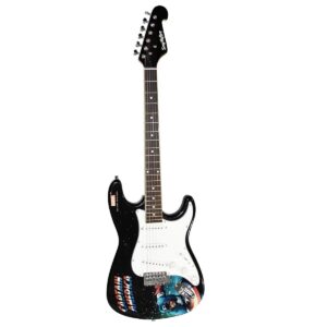 Paquete de guitarra eléctrica con gráficos del Capitán América, cuerpo de basswood, brazo de maple, diapasón de rosewood, 3 pickups sencillos, 1 vol, 2 tonos, switch de 5 pasos, tremolo standard, combo de 10W, tahalí, funda, silbato afinador, 3 púas y cable.