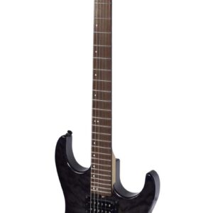 Guitarra eléctrica con cuerpo de basswood, tapa en maple acolchado, brazo de maple, diapasón de palo de rosa, controles: 1 vol y 1 tono, selector de 5 posiciones, 2 potentes humbuckers y 1 single coil, trémolo Floyd Rose Lic, maquinaria diecast, hardware negro, 24 trastes.