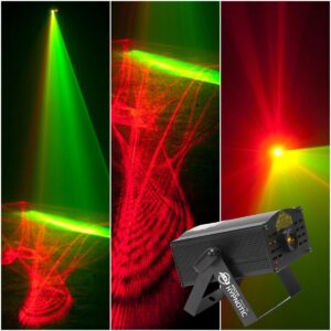 Láser mini único que proyecta patrones verde y rojo tipo red, diseño de carcasacompacta, 2 modos de operación: Automático o activación por sonido, incluye soporte doble para colgar, cumple con los estándares FDA, enfriamiento por ventilador, incluye fuente de alimentación UL, incluye control remoto inalámbrico RF.