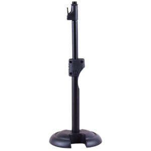 Mini microphone stand, Quik-N-EZ adapter for instant microphone attachment, Quik-N-EZ height adjuster that snaps back into position when pushed up, H-shaped base weighted for maximum stability, height: 280 at 445mm, weight: 1.6kg, ideal for desktop, amps and kick drums.
