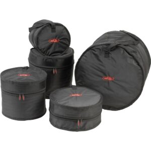 Heavy-duty Gig Bag set for drums, made of ballistic nylon, ergonomic handles with double-stitched straps for maximum durability, 5 bags that fit 14 x 6.5” snare, 9 x 10” and 10 toms x 12” inches, 14 x 14” inch floor tom and 18 x 22” inch bass drum.