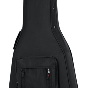 Acoustic guitar case, ARMOR series, made of water-resistant 1680D nylon, adjustable retractable padded back straps with metal hooks, comfortable foam mesh handle, soft velor lining with additional sewn-in protection for bridge and mechanics, large front pockets with several compartments for music books, tablets, cables and accessories, reinforced cast aluminum DH zipper pulls, 35 mm DHFOAM padding.