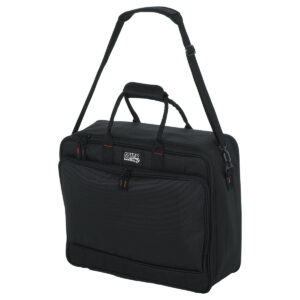 Funda para mezcladoras de hasta 20” x 20” x 5.5”, exterior de nylon resistente, protección acolchada de doble capa de 10 mm, interior forrado de tricot protector, correa de hombro extraíble y cómodas asas palmeadas, bolsillos externos de almacenamiento con gestor de cables.