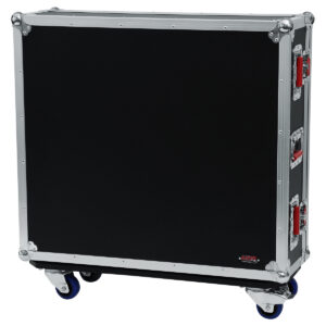 Estuche ATA para mezcladora X32 de gran formato de Behringer, fabricado con madera contrachapada de 9 mm con exterior protector laminado, interior laminado negro con bloques de espuma EVA para protección que dejan espacio para la parte del ventilador en la parte inferior, hardware de grado comercial, cierres bloqueables y cierre grande rojo Signature Gator, manijas de goma con resorte, esquinas protectoras de bola, ruedas incorporadas y asa de remolque.
