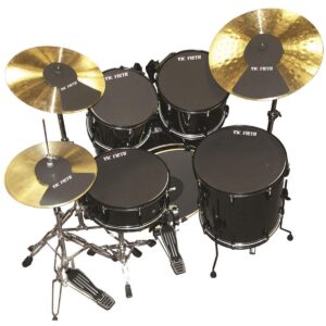 Practice pack to decrease drum volume, includes pads for 10”, 12”, 14” (2) and 20” inch drums, two cymbal pads and one snare pad.