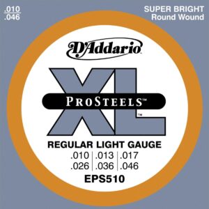 Juego de cuerdas para guitarra eléctrica, serie ProSteels, regular blandas, calibre 10-46, aleación de acero resistente a la corrosión altamente magnética, tono súper brillante sin sobretonos estridentes, agudos armónicamente abundantes y penetrantes combinados con graves pronunciados, ajustados y duros, paquete ecológico y resistente a la corrosión para conservar la frescura de las cuerdas.